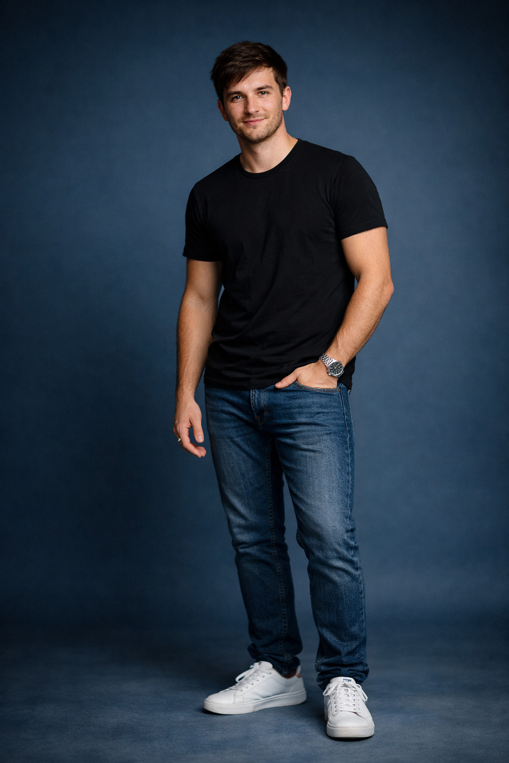 { "prompt": "Studio portrait of a young man, same appearance as the reference, posing confidently with relaxed body language. Minimal studio lighting, soft directional light fully focused on him while background remains subtle. He is wearing a stylish casual outfit (casual shirt or tee, fitted jeans, clean sneakers). Blue studio wall background, clean professional look, high-resolution, sharp details, cinematic yet natural, DSLR depth of field, realistic textures.", "style": "photorealistic", "lighting": "soft minimal focused key light", "camera": "85mm lens, shallow depth of field", "resolution": "4k", "mood": "confident, modern, composed" }