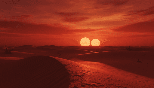 Two people sitting on top of sand dunes, a red sky, and two suns in the background