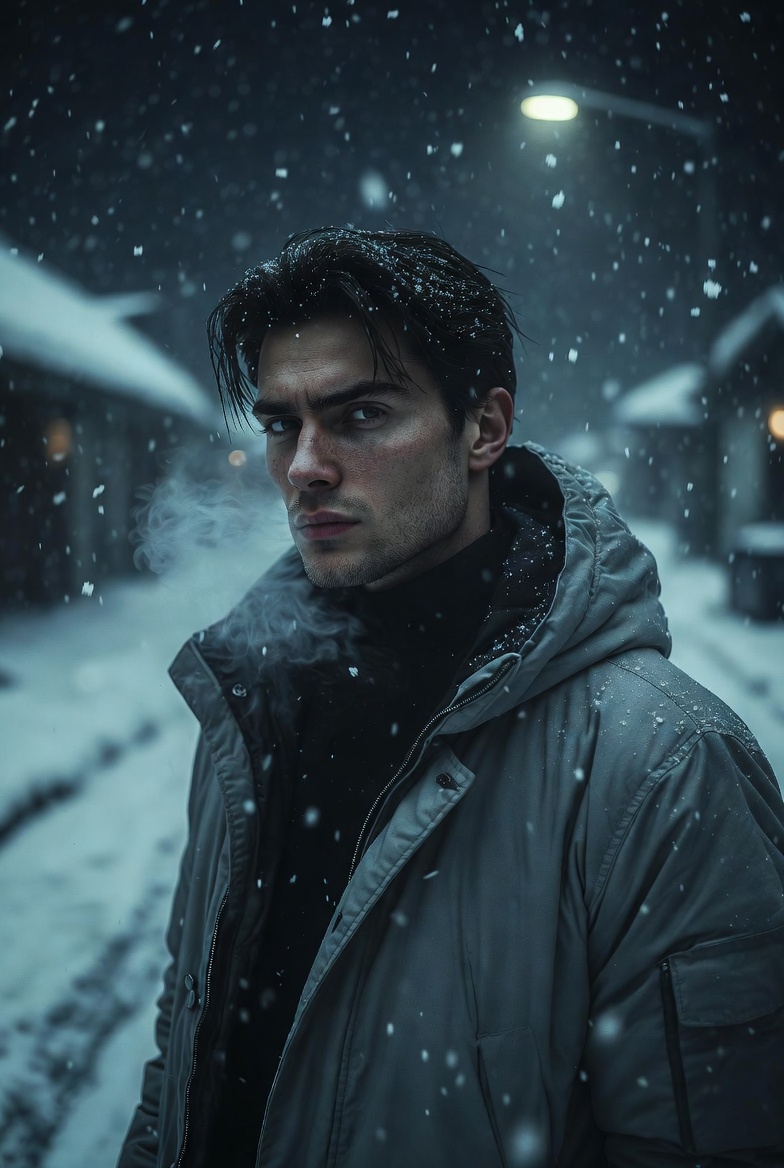 Ultra realistic cinematic portrait of a young man with sharp masculine features and light stubble, snow dusted hair slightly longer and pushed back, calm but intense eyes looking slightly away from the camera, wearing a charcoal hooded winter jacket layered over a black turtleneck, standing in a deserted snowy street at night, heavy snowfall swirling around him, snowflakes catching light mid air, cold breath visible, dim ambient street lighting with a single overhead lamp casting soft shadows, background filled with snow covered buildings and faint fog, low key lighting with cool blue tones, subtle rim light separating the subject from the background, medium close up framing, 50mm lens look, shallow depth of field, cinematic contrast, realistic skin texture, film grain, moody atmosphere, loneliness, quiet strength, winter noir aesthetic, professional photography realism.